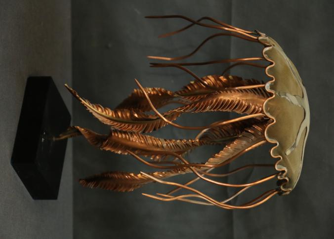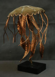 John Stark Metal Sculpture Depicting a Jellyfish. Crafted from metal with intricate copper and brass details for the jellyfish body and tentacles. Mounted on a black base with a visible chip on the base's corner. Pickup only.