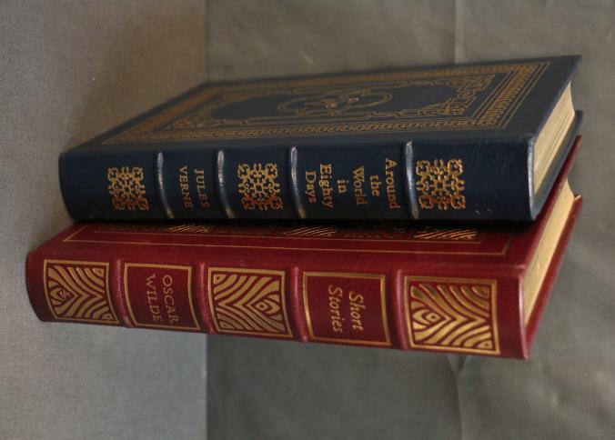 The Short Stories of Oscar Wilde and Around the World in Eighty Days by Easton Press are leather-bound collector's editions with gold leaf page edges and extensive illustrations. The Oscar Wilde volume features illustrations by James Hill, while the Jules Verne volume includes artwork by Edward A. Wilson. Copyright 1976 and 1983 by The Easton Press.