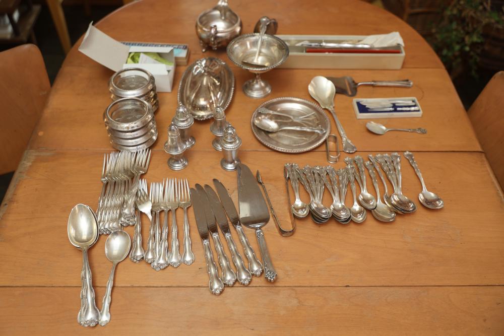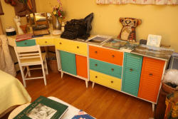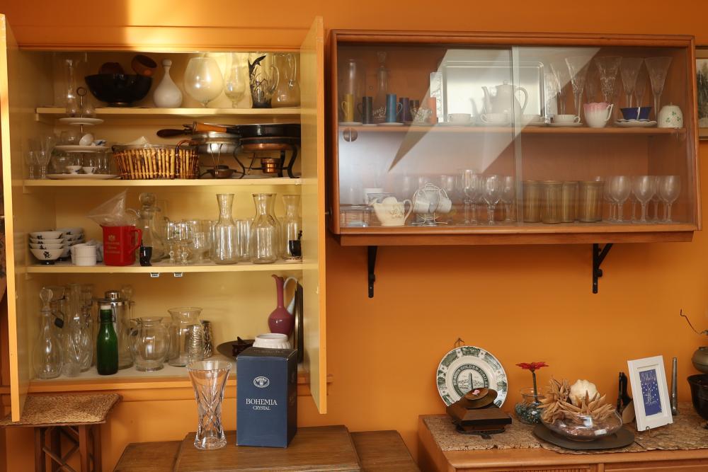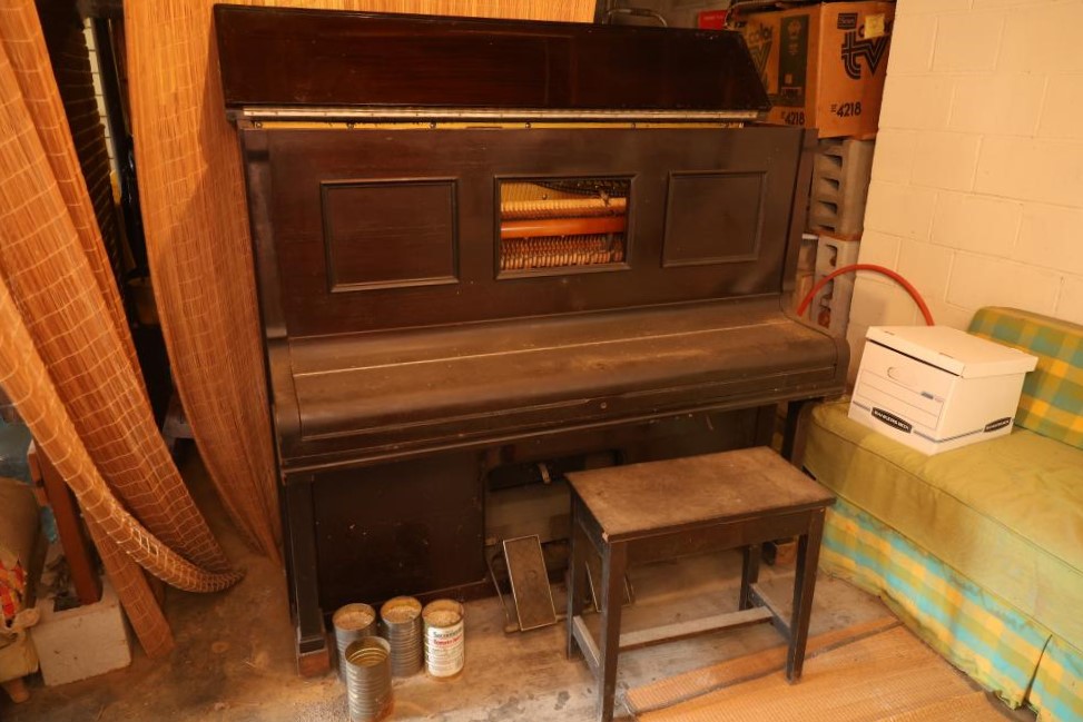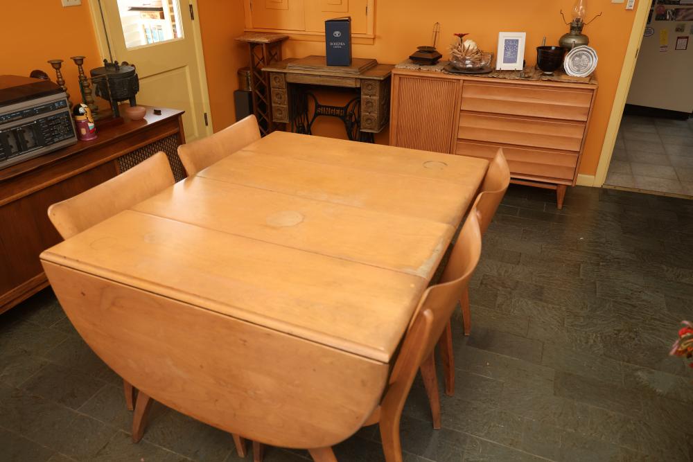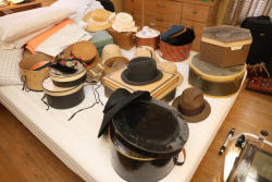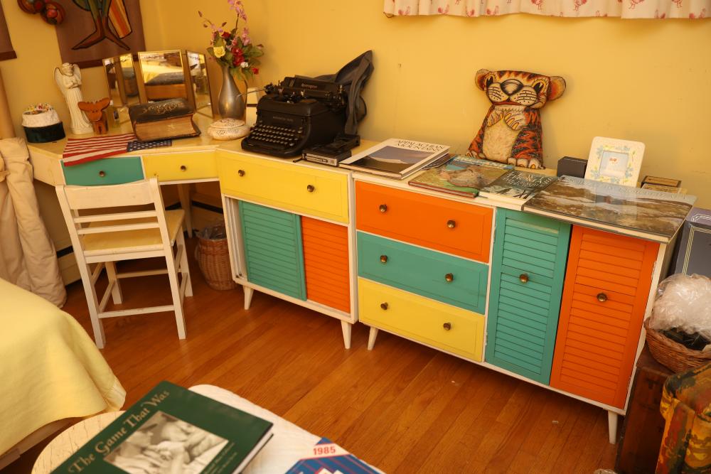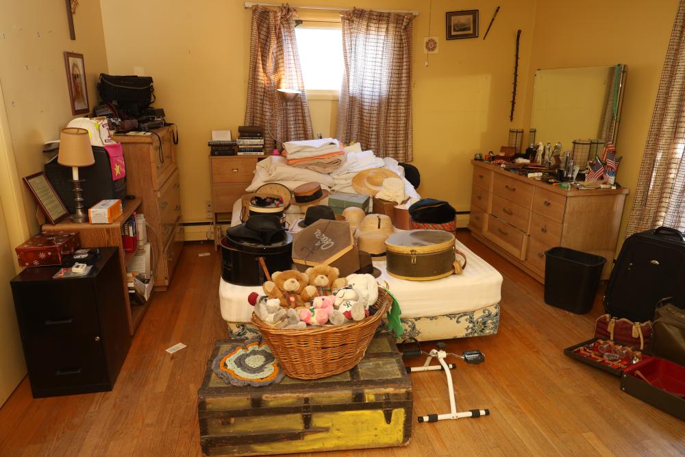 Huffman-Boyle Bedroom Furniture, Wooden Trunk, Cameras, Clothing, Luggage, Accessories, incl; nine drawer wooden dresser with metal pulls (61in x 20in x 32in) and attached mirror, five drawer tall dresser with metal pulls (40in x 19in x 46in), 59in head board with two sliding doors and detached bed frame on wheels, filing cabinet, vintage wooden trunk marked Benj. Dickenson Trunk Mfg., Kodak Instamatic X-45, electronics and media include a Sharp CRT television with integrated VCR/DVD player, various VCR tapes, a box of computer disks, multiple clocks and digital timers, a vintage Argus L-3 light meter in box, Polaroid SX-70 instant cameras, assorted Argus and Olympus film cameras, and numerous leather camera cases with a Samsonite shoulder bag, several rolling suitcases, a brown leather duffel, a hard-sided suitcase, an aluminum-framed briefcase, a maroon travel bag, and a portable cocktail kit with tools in a red-lined case. Items on dresser include costume jewelry, wallets and coin purses, small US flags, lighters, plush toys, decorative scarves and women's sweaters, pants, shirts, small wooden boxes, and assorted books, documents, and figurines. DOES NOT INCLUDE HATS. Does not include items from other lots. Buyer is responsible for all help and materials necessary for safe and proper removal. Buyer must take all. Items located on first floor, no stairs. Pickup only.