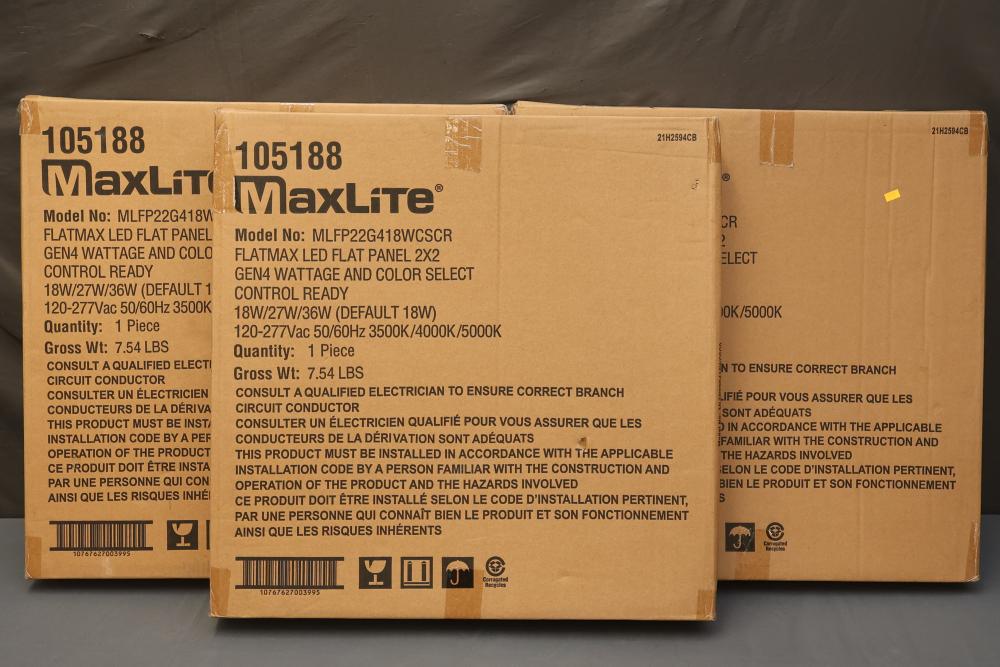 MaxLite 105188 FlatMax LED Flat Panel 2 ft by 2 ft, Gen 4 Wattage, Color Select, Control Ready. Includes three units with adjustable wattage settings of 18W, 27W, and 36W and selectable color temperatures of 3500K, 4000K, and 5000K. Operates on 120-277 Vac at 50/60 Hz. Suitable for damp locations and installation above ceiling tiles. Pickup only.