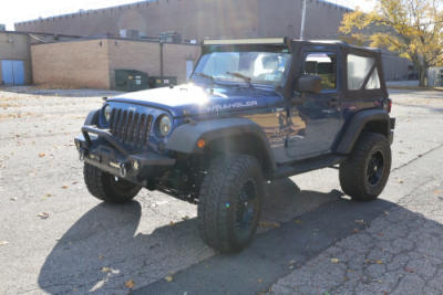 2010 Jeep Wrangler Sport 4x4 two-door SUV with automatic transmission. VIN: 1J4AA2D17AL176344. Odometer reading: 145,502. Exterior: Blue with black aftermarket front bumper, hood latches, soft top, light bar, and large off-road tires mounted on black wheels. Interior: Gray and black front bucket seats, center console, automatic shifter, and standard dashboard with factory gauges. Tire size: P225/75R16. Additional equipment includes light bar, custom front bumper with D-rings and fog lights, side steps, and "Trail Rated" and "JK Sport Wrangler" decals. Title and key available. Seller reports: Runs and drives, motor replaced approx. 500 miles ago.