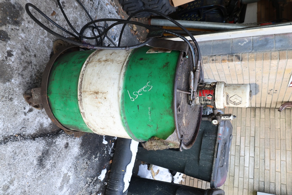 Graco quiet Fire-Ball air powered pump, power greaser with grease gun and 400lb barrel of Castrol Pyroplex red high performance EP grease UIGI 2, part number 52259. Seller reports some grease has been used, barrel is mostly full, exact level unknown.