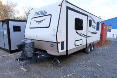 2016 Forest River Micro Lite travel trailer, model 25FKS, VIN: 4X4TFLA27GD408473. With a dry weight of 4,748 lbs and a cargo carrying capacity of 1,453 lbs. It has a gross vehicle weight rating (GVWR) of 6,260 lbs, and rides on ST205/75R14C tires with a specified cold tire pressure of 50 PSI. The trailer includes dual axles rated at 3,000 lbs each, a front kitchen layout, and features a Domestic refrigerator, propane/electric water heater, and a combination stove and oven. It is equipped with an electric tongue jack, rooftop air conditioning, slide-out section, power awning, and ladder access at the rear. Unknown electrical issue, power slide does not function, needs to be manually opened (tool not included). Title and key available Title will transfer via dealer paperwork in Highland NY.