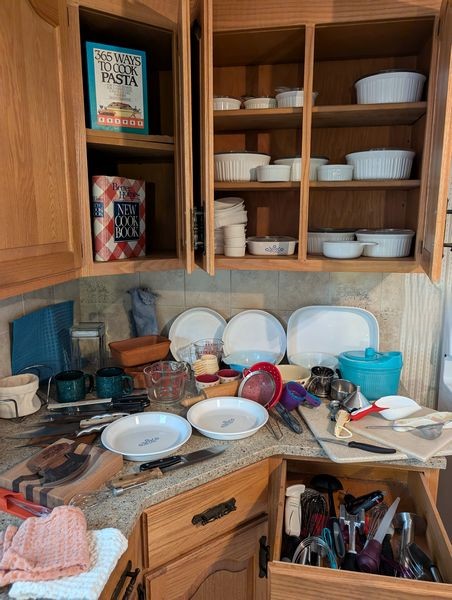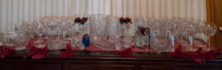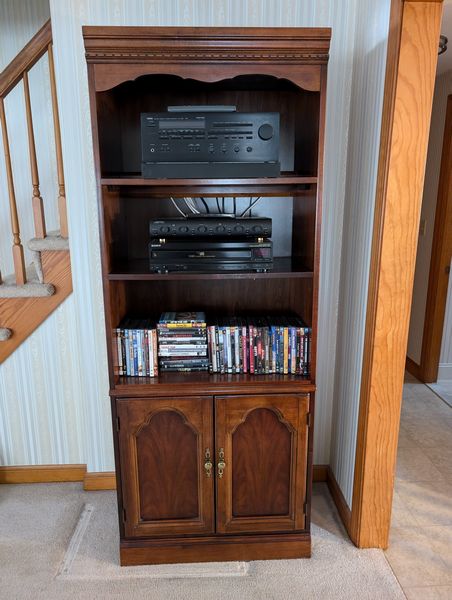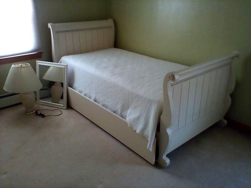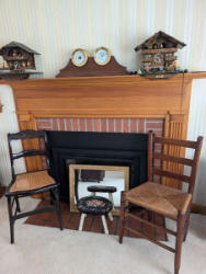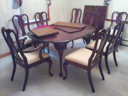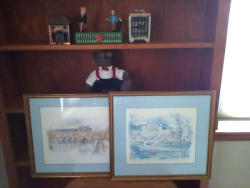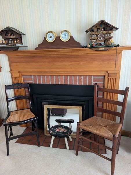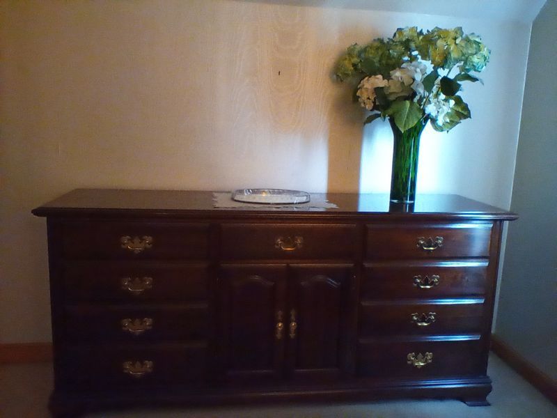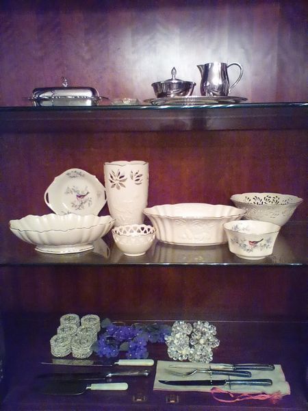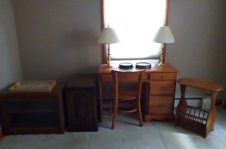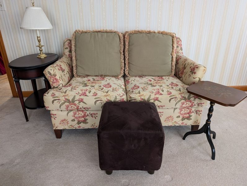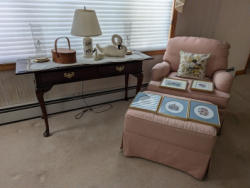 Upholstered Chair, Ottoman, Sofa Table, Décor. Marlborough Country Barn fully-upholstered skirted chair, 32"Wx33"Dx3'H with matching skirted ottoman, 27"Wx20"Dx16.5"H; queen Ann cherry finish sofa table, 52"Wx16.5"Dx27.5"H with two dovetailed drawers; porcelain table lamp, 18"H; assort decor incl swans; pr oil lamps; Hancock Shaker oval wood handle basket; five pcs wall art; throw pillow. See photos for details.
