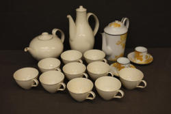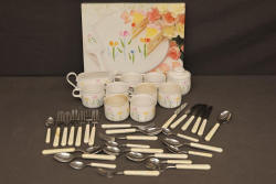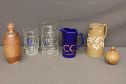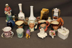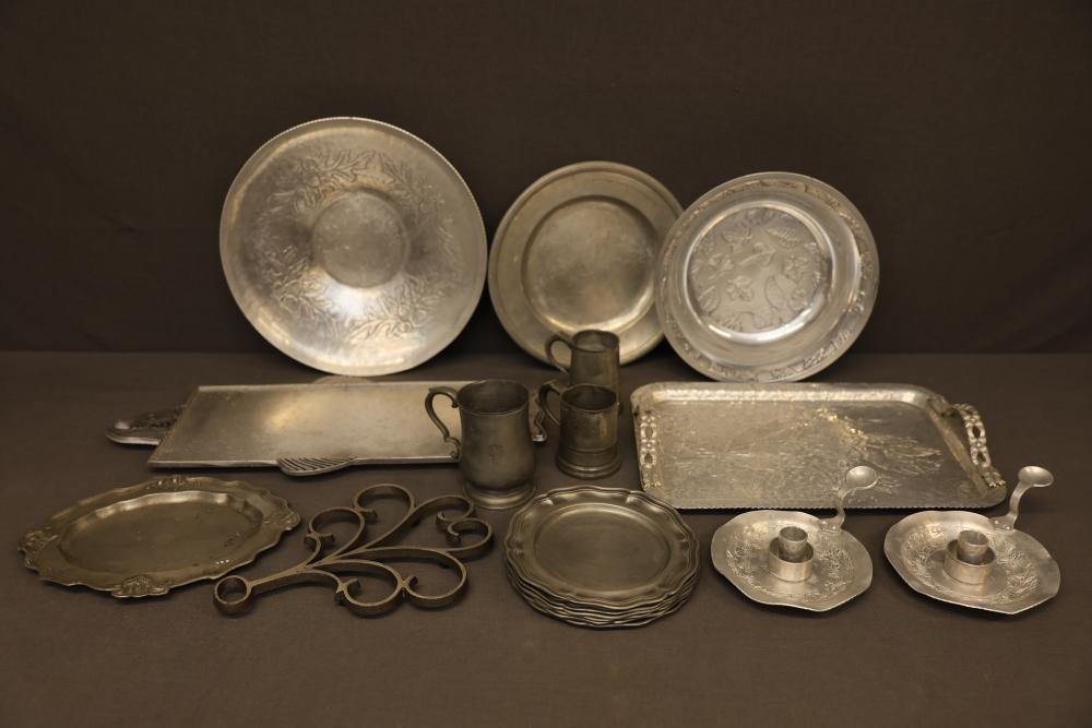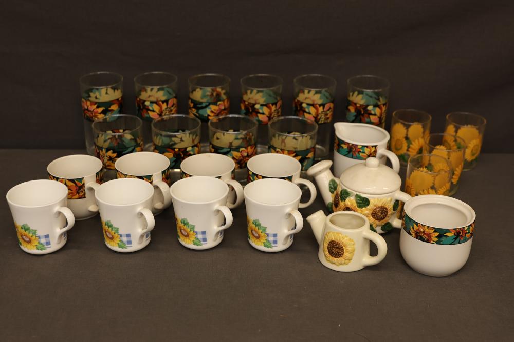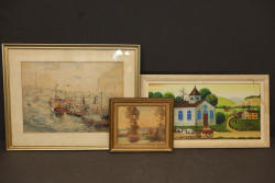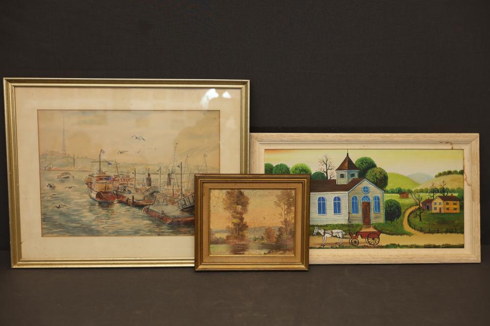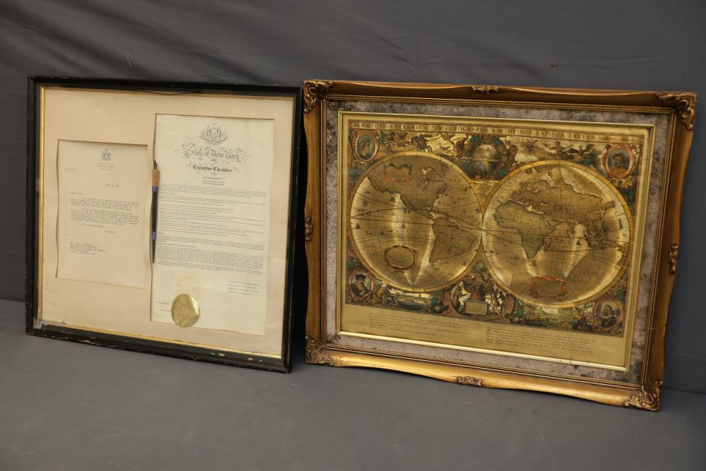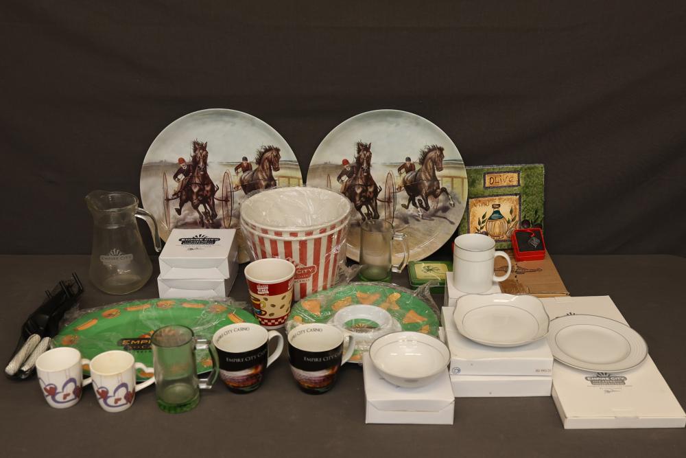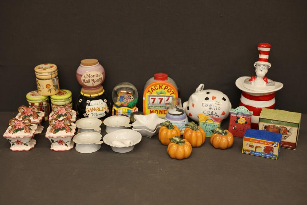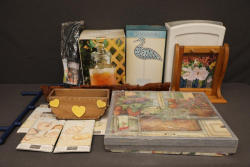 Home decor items, including a carved wooden panel with a dragon motif, a ceramic planter with heart accents, a framed floral artwork, a mosaic heron design, a plastic storage drawer, decorative seashell napkins, and a boxed glass beverage dispenser. Items are in varied materials and designs, with some boxed or wrapped. Pickup only.