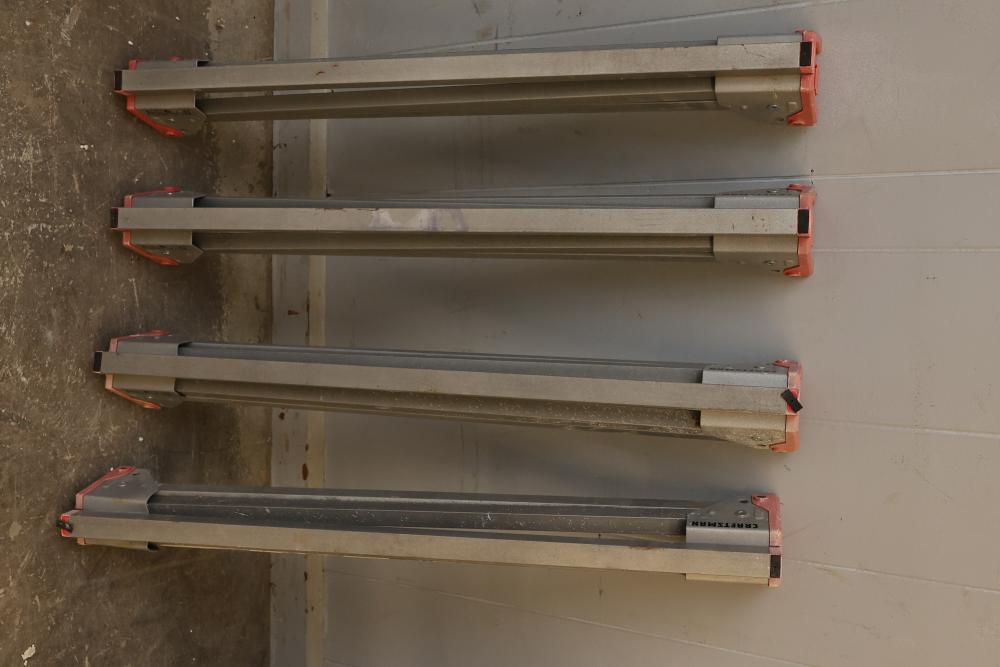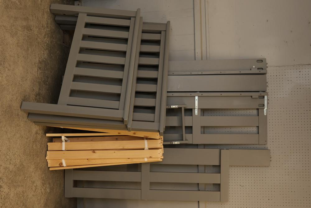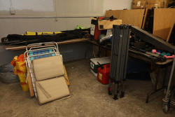 Outdoor and sporting equipment including folding chairs, inflatable floatation devices, O'Brien Elite Star water skis, Adirondack-style fishing rods in a carrying case, a Rawlings baseball glove, a pair of goggles, multiple dumbbells, a foam roller, a cooler, a red fuel container, packaged items, and other related accessories. Pickup only.