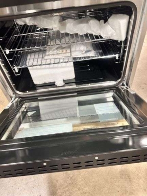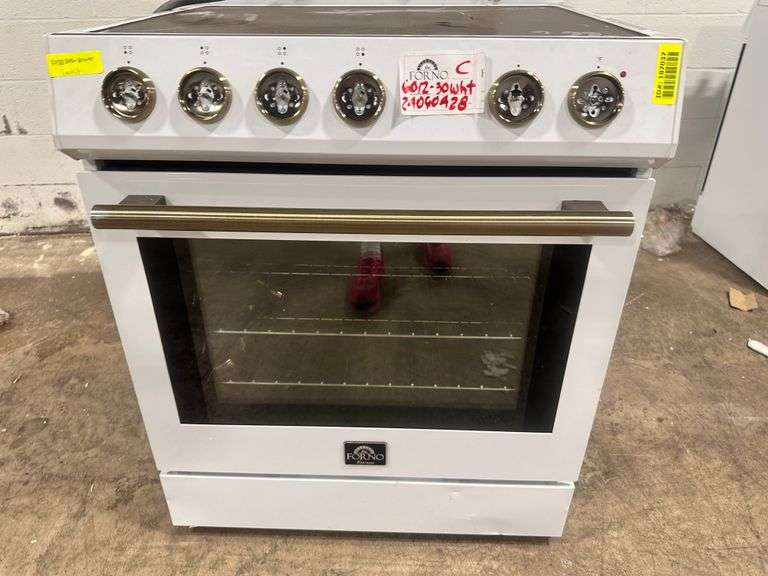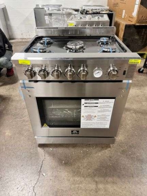 Forno Gas Range FFSGS6276-30 Stainless Steel 30". Missing grates, This is a Forno gas range, model FFSGS6276-30, featuring a stainless steel finish and a 30-inch width. It includes five control knobs for varying burner sizes, a built-in oven with a glass window, and a temperature gauge on the front panel. The unit is designed for natural gas or LPG with specific injector sizes and outputs detailed on the label. The range shows some grade B cosmetic imperfections including dirt, dents on the sides, small dents on the kick plate, and a dent on the rear support. The unit is new but untested. This gas range offers powerful cooking options with burners rated up to 19,000 BTU for wok cooking and an oven rated at 16,000 BTU, making it suitable for home or commercial kitchens looking for versatility and reliability. The stainless steel construction provides durability and an attractive finish that fits modern kitchen designs. This is a liquidated product. The Auction Company makes no express or implied representations or warranties of any kind regarding the Product. Any pre-existing retail, wholesale or manufacturer warranties will not transfer with the sale of this Product unless expressly stated otherwise on this page. The Buyer accepts the Product in as-is condition, with all faults. Weight: . Sold by: Piece. Sold as: Price x Quantity.